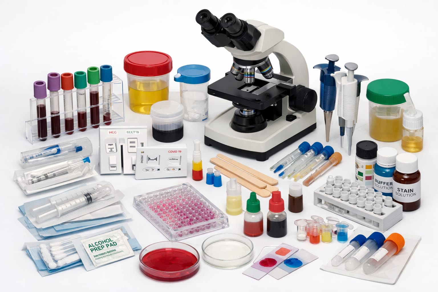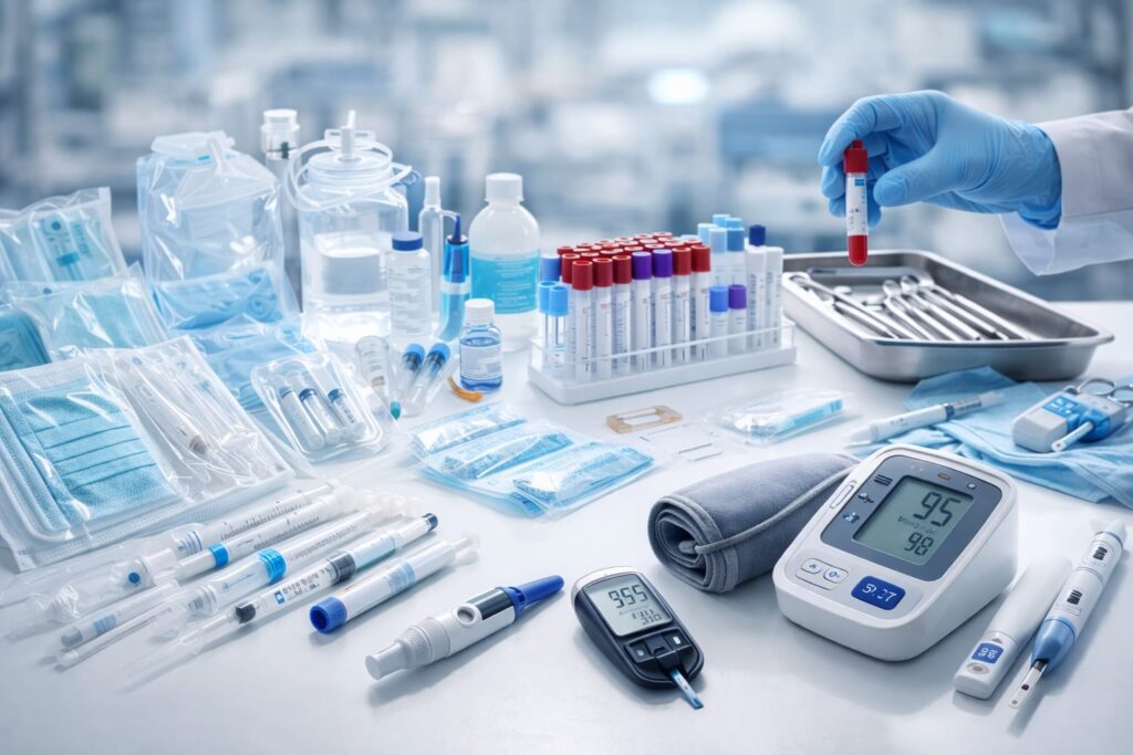 Vacuum Blood Collection Tubes, EDTA Tubes, Serum Separator Tubes, Blood Lancets, Swab Sticks (Nasal / Throat), Sample Containers, Urine Sample Cups.
